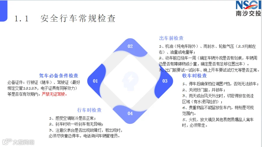 此次培训以《南沙大型车辆交通事故宣传视频》切入,通过多媒体课件的形式对日常安全行车检查、轻微交通事故定责原则、交通事故应急处置等三个方面进行讲解分析,告知参会人员知危险、会避险,敦促大家认真学习交通法规,开文明车,走文明路,做文明人。培训的最后播放了交通安全宣传片-《让生命无憾》,教育大家遵守交通法规,增强自我保护意识。