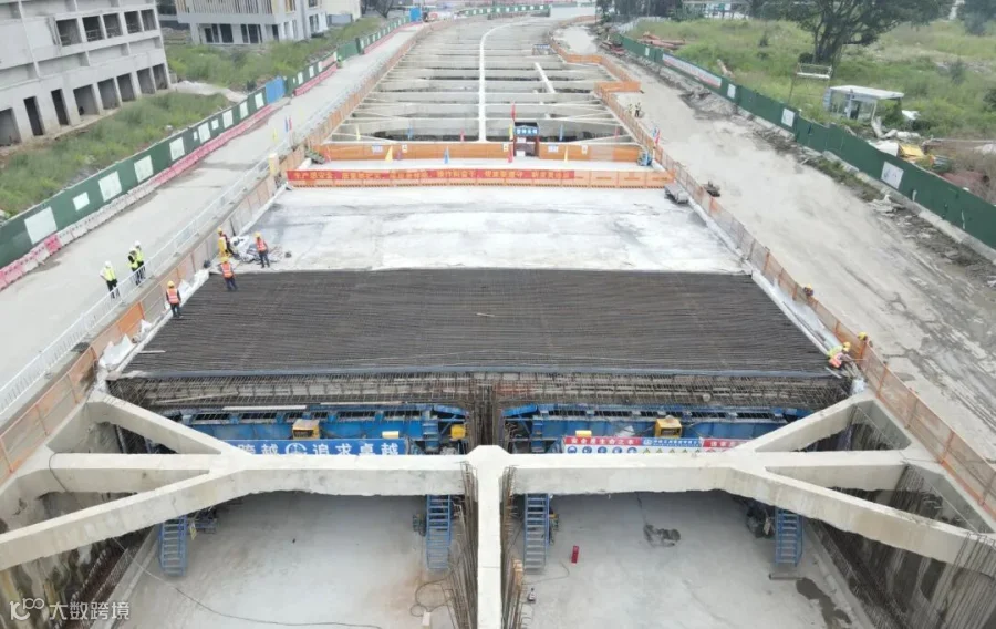 2024年5月15日上午,在南沙区建设中心局副主任卿仁杰、质安部部长文志成、公司总工程师刘志伟的共同主持下,凤亭大道项目隧道最后一板顶板混凝土浇筑完成。这一里程碑事件标志着南沙区市政道路首个明挖式隧道结构工程顺利收官,项目正式进入装饰收尾阶段,为“6.30”的通车节点奠定了坚实基础。