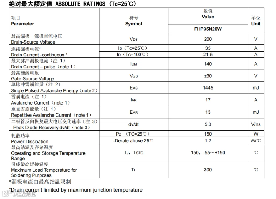飞虹这一款FHP35N20W的具体产品参数,具有35A、200V的电流、电压,RDS(on) = 69mΩ(typ) @VGS = 10 V;RDS(on) = 80mΩ(MAX) @VGS = 10 V,最高栅源电压@VGS =±30 V。