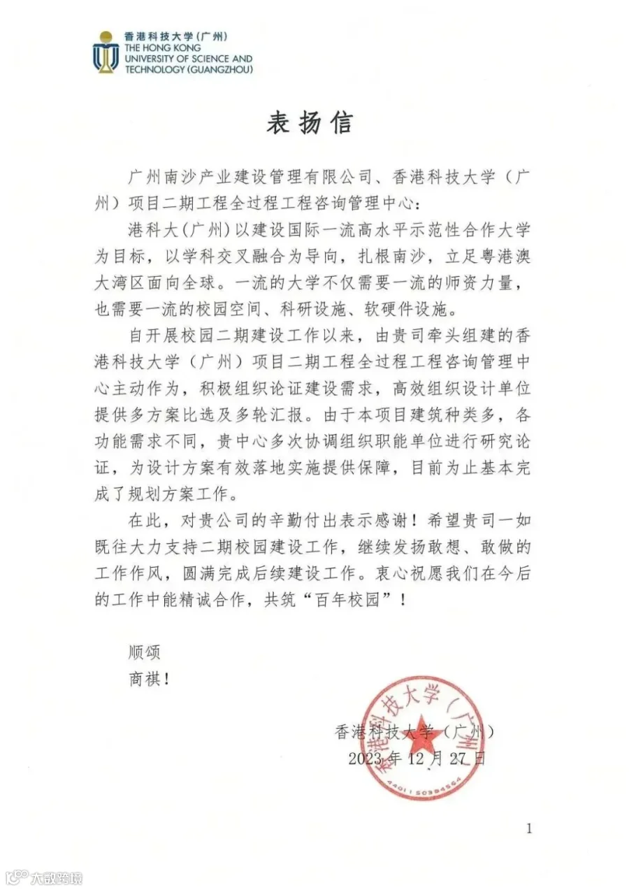 近日,公司收到来自香港科技大学(广州)的表扬信,信中特此感谢公司参与项目人员以及香港科技大学(广州)项目二期全过程工程咨询管理中心人员的辛勤付出!