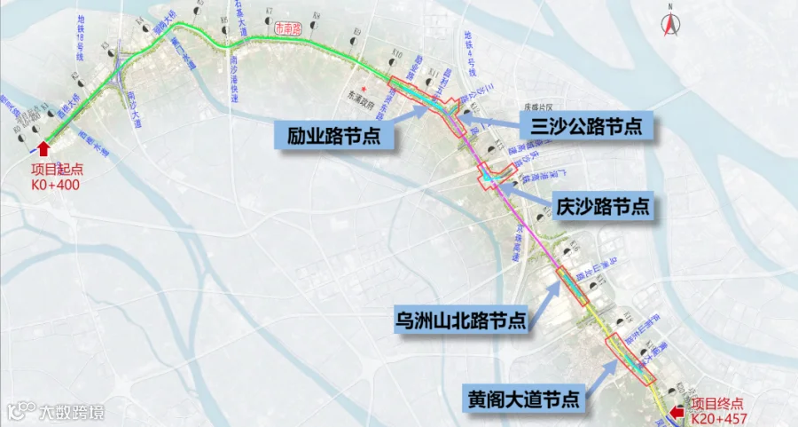 市南路快速化改造(一期)工程总投资高达42.73亿元,线路起始于省道S111,终止于凤凰大道,全长约20公里;针对励业路、三沙公路、庆沙路、乌洲山北路、黄阁大道5个重要节点新建跨线桥、匝道及隧道;通过全线取消、减少信号灯、设置分离式立交、实行车道主辅分离等方式实现道路快速化!同时,改造升级普通路段的绿化景观、交通照明、在人流密集处共设置6座人行天桥及完善人非车道慢行系统。