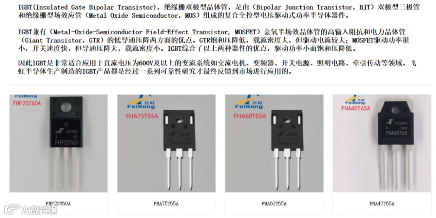 今天先给大家介绍飞虹半导体4款IGBT单管的常用领域介绍,理解国产IGBT的产品特点优点。