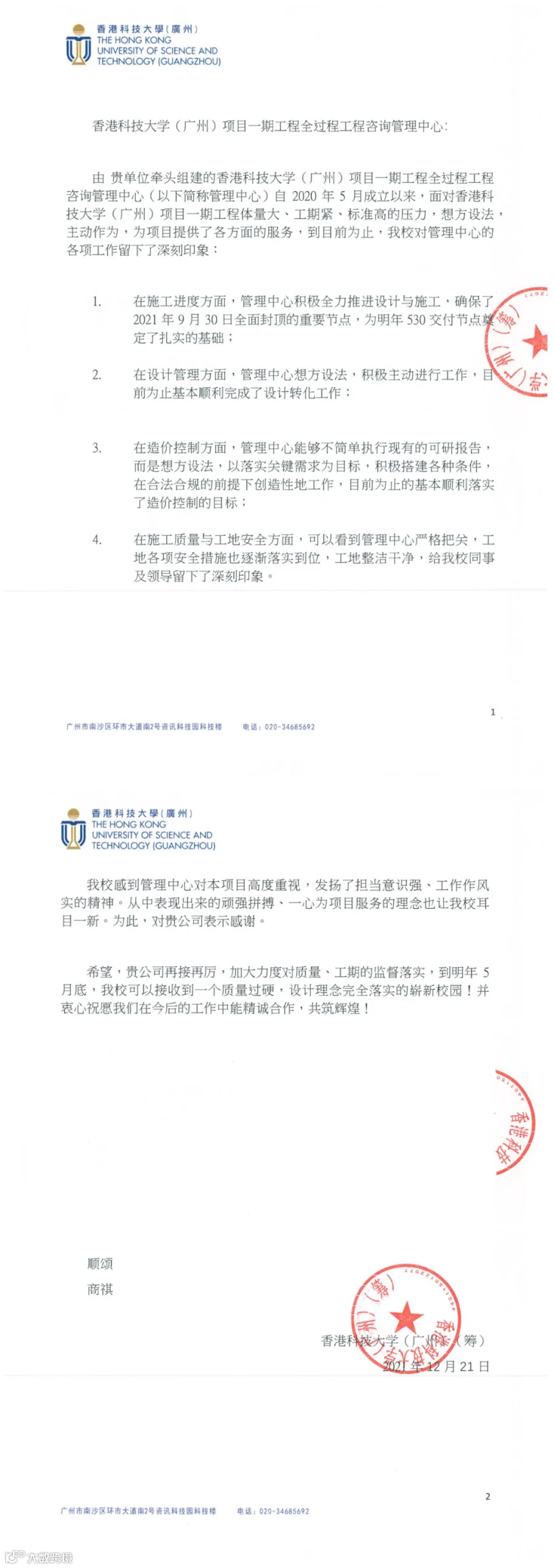 信中对公司牵头组建的香港科技大学(广州)项目一期工程全过程工程咨询管理中心,在设计管理、造价控制、施工