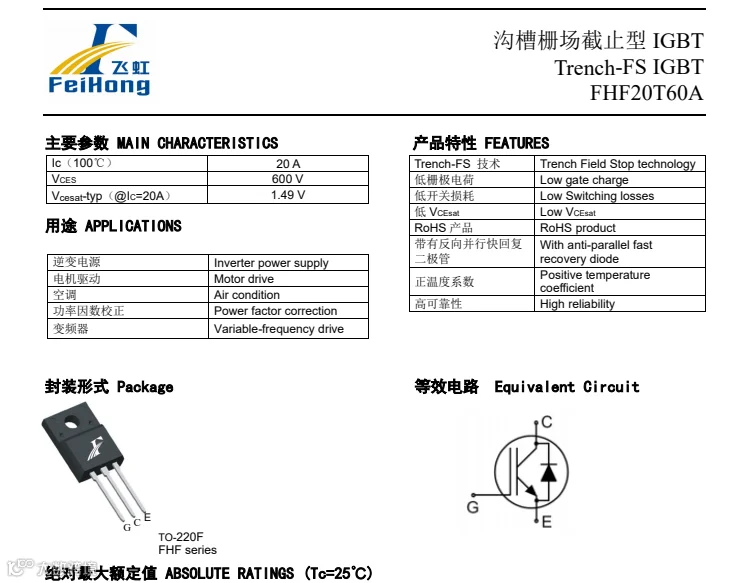 FHF20T60A型号单管拥有出色的导通压降与极短的拖尾电流,能为电机驱动开发的客户在优化系统效率时提供有力的帮助。