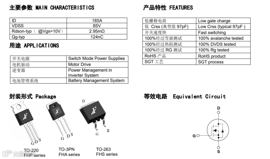 来看看飞虹这款FHP170N8F3A的具体产品参数,具有185A、85V的电流、电压,RDS(on) = 4mΩmax) ,最高栅源电压@VGS =±20 V,100% EAS测试,100% Rg测试,100% DVDS测试,极低的FOM(RDSON*Qg),极低的输入电容的特点。