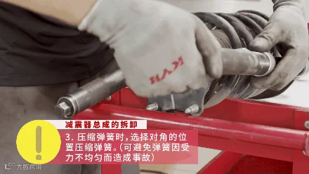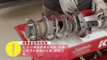 在拿下减震器总成后,先为塔顶与弹簧的位置做记号便于后续锁定安装位置,用弹簧压缩机或卷式弹簧拆卸工具来拆卸减震器总成,对比KYB产品与原厂是否存在偏差。