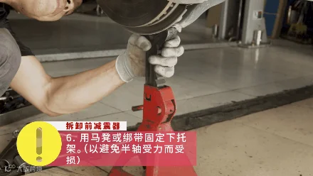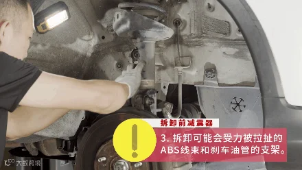 在拆装前减震器时需要注意到减震器与刹车盘等部件都相关联,建议先进行ABS线束与刹车油管支架的拆卸以避免受力拉扯,同样的,用马凳或绑带固定下托架,避免半轴受力而受损。在最后拆卸减震器固定在车体的上部螺母时要用手扶住减震器,避免突然掉落。