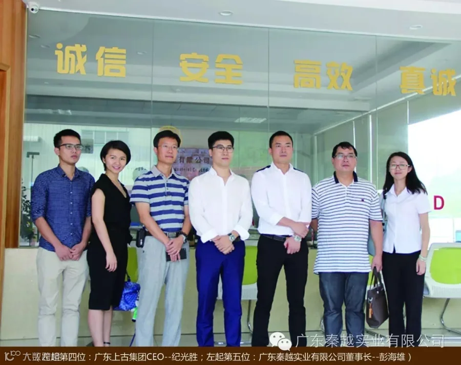 2016年10月26日,广东上古集团(简称“上古集团”)CEO纪光胜一行来到广东秦越实业有限公司(简称“秦越实业”)进行实地考察,并在董事长彭海雄的陪同下参观了秦越仓储项目,双方就塑料仓储、物流、金融服务等多个领域达成了战略合作协议。