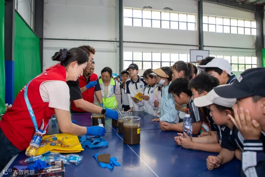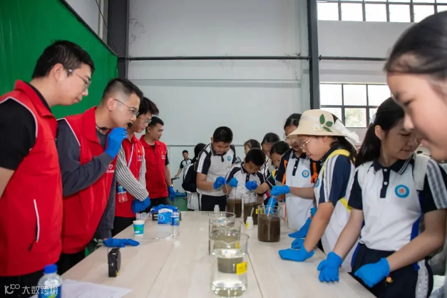 除了理论课堂以及实地参观之外,净水公司还准备了污泥沉降性实验以及污泥处理处置与再生利用的相关知识。污泥沉降性实验现场,同学们在工作人员的陪同下亲手观察絮凝剂助力污泥快速沉降、上清液逐渐清澈的全过程,直观解锁了二沉池的工作奥秘;在污泥处理处置与再生利用摊位,漂浮水中的污泥、减量化后的紧实泥饼,还有用污泥制成的砖、陶粒、RDF燃料棒等副产品,经过工作人员的讲解,同学们清晰地了解到污泥从废弃物到可再生资源的神奇转变,感受资源循环的环保意义。