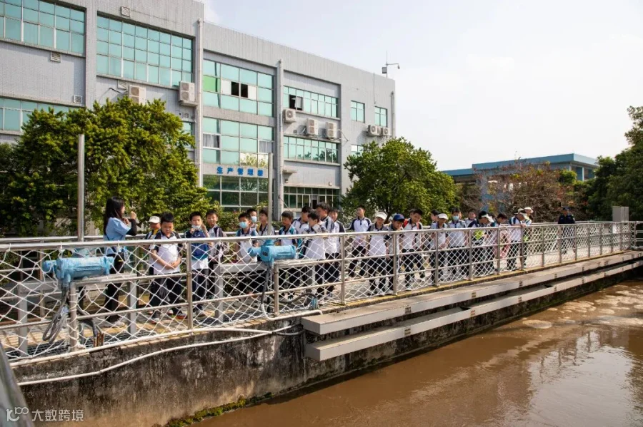 接下来,净水公司的工艺技术员带领同学们开启“污水重生”的探秘之旅。走到生化池上,大家围拢倾听微生物“净化魔法”,踊跃提问、认真记录;来到直径45米的圆形二沉池,静止的池水使水和污泥快速分离,污泥沉淀池底,池面清澈的水则流入深度处理段进一步净化;到出水明渠前,哗啦啦的再生水奔涌而出,最终汇入东莞运河,同学们亲眼见证灰褐色污水一步步变成澄澈清流,深深震撼于污水净化背后的不易。