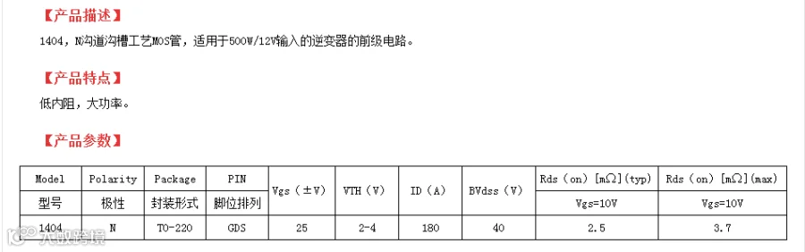 上面也有说到,对于500W/12V输入的逆变器的前级电路,常见使用的国外型号是:IRF1404。但由于国际形势的影响,今年大家都需要在国内寻找优质的纯国产替代型号的厂商。那么究竟在国内是否有优质的型号参数可以替代IRF1404型号参数呢?