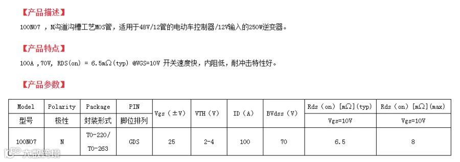 FHP100N07为N沟道沟槽工艺MOS管。该产品广泛适用于48V/12管的电动车控制器/12V输入的250W逆变器。在使用方面是不仅能匹配型号为HY1707场效应管,还能代用型号为:IRF3205、HY1906、RU7088这几款型号场效应管。