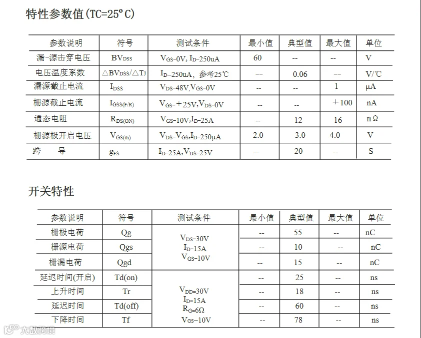 这款N沟道沟槽工艺MOS管的参数特点是50A,60V, RDS(on) = 12mΩ(typ)@VGS=10V开关速度快。仅从参数方面就可以看到基本是能够与IRFZ44N对标的。