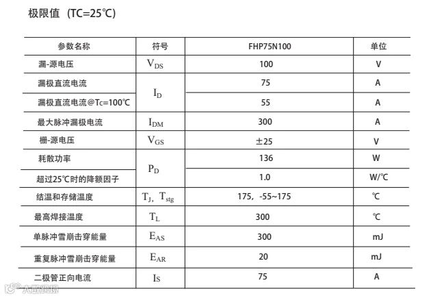市面上除了常见的HY3010型号会应用在同步整流电路上外,还有IRFB4610、NCE01H10这两款MOS管在应用,而作为小编更推荐使用优质的飞虹国产型号:FHP75N100。这一点上面也说过,究竟是为何。因此我们直接来看详细参数: