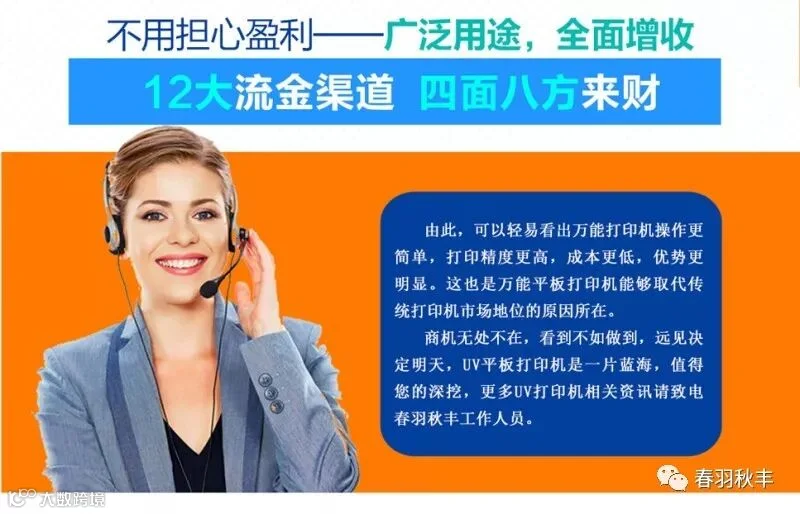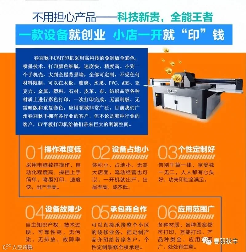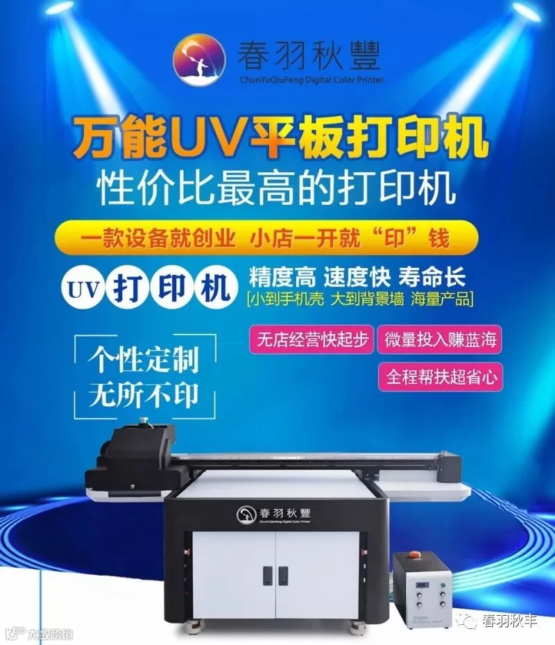 春羽秋丰,引领科技创新,描绘彩色世界,只为您提供上乘UV平板打印机。UV平板打印机是一款高科技高含量的印刷设备,其作用就相当于传统的丝网、移印、热转印等印刷工艺,故有“万能UV打印机”之称。现在逐步的替代传统繁琐的印刷工艺,所以说UV平板打印机创业的市场也是我们的传统印刷工艺的市场。