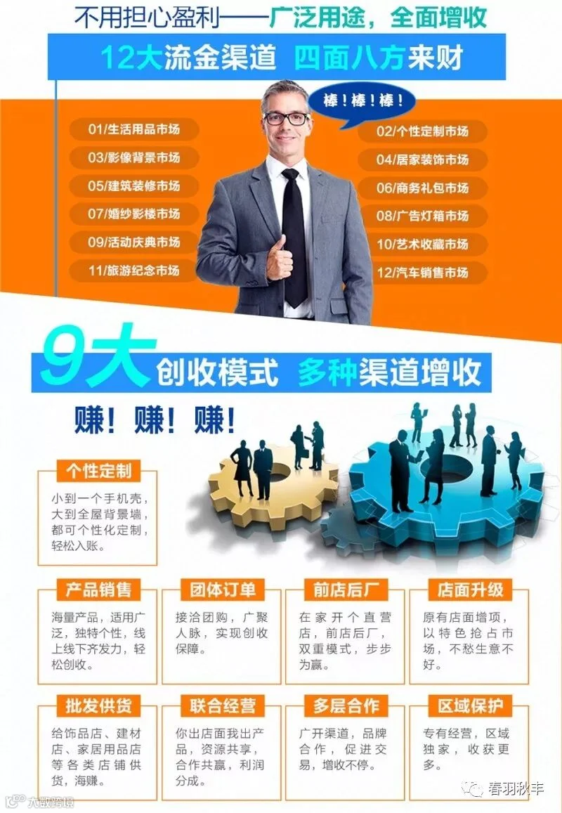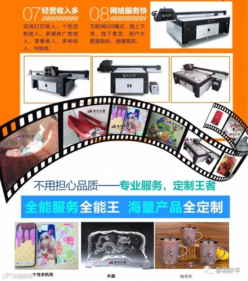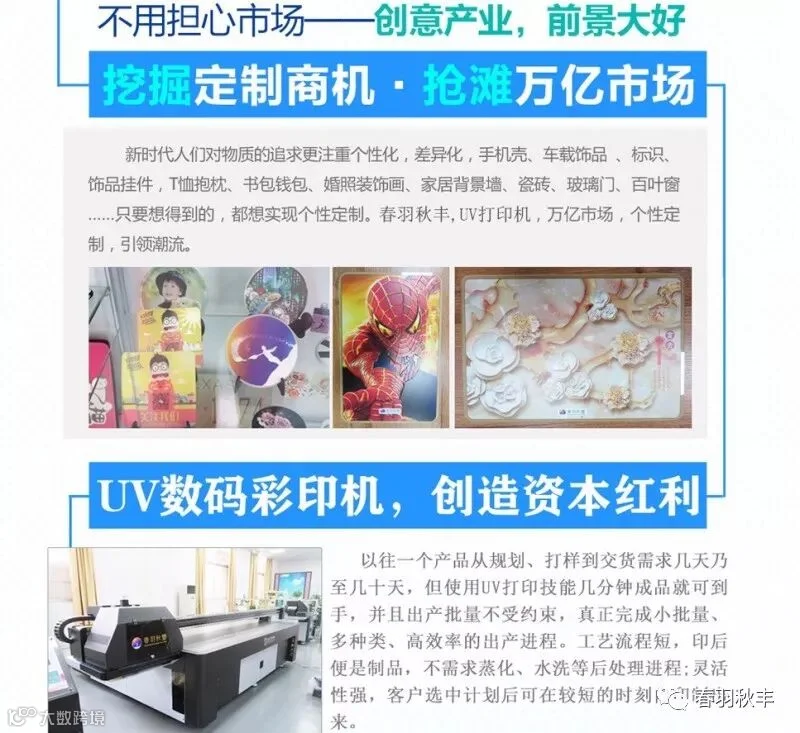 目前我们春羽秋丰拥有各行业的客户,但不论是哪种行业的客户,UV平板打印机给他们产生巨大的利润空间。在现在这个需求多样化的时代,相信拥有一台UV平板打印机,再加上我们优质的服务,一定能够赚取更多的利润。