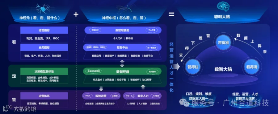 基于企业经营管理痛点,以“经营运营人才一体化”为核心,以数据为神经元、工具为神经中枢,围绕数据上得来、管理下得去的设计思路,构建企业经营数智大脑,通过联通+联动,打破业务壁垒,助力管理场景从单一到复杂,管理决策从经验判定到数据决策,管理半径从分段到闭环,让管理为经营结果服务。