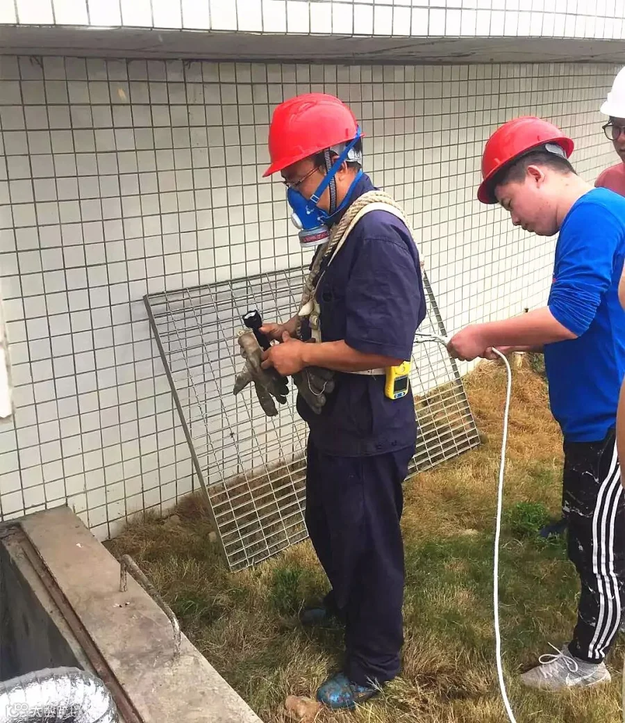 技术员使用复合式气体检测仪检查井内气体,确保环境安全。