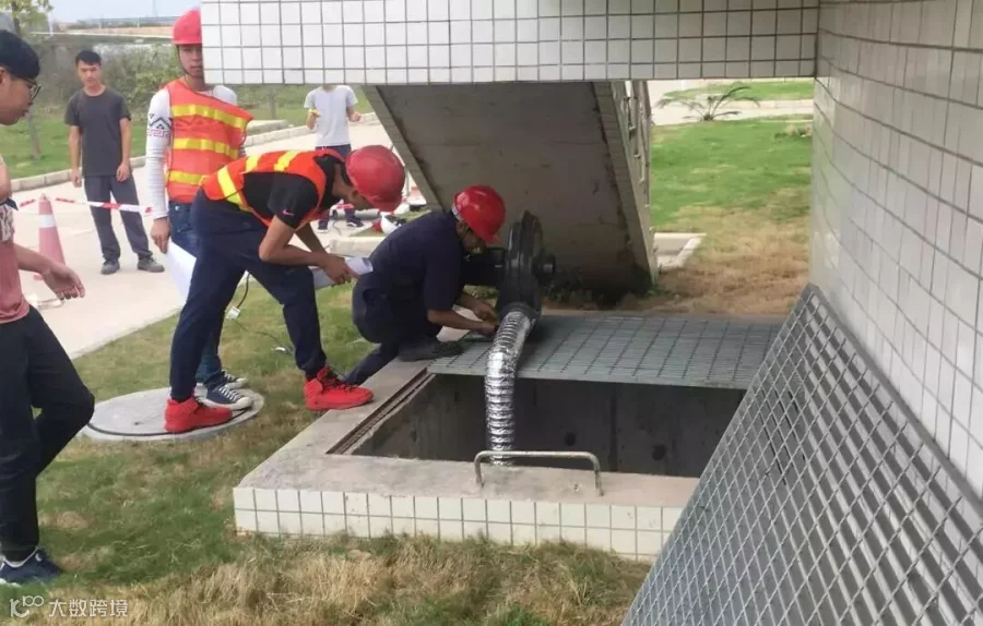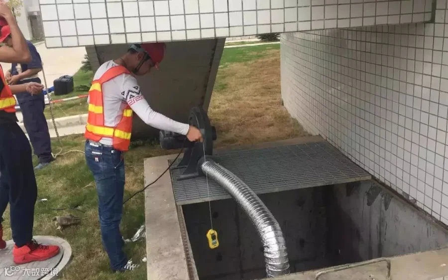 安全员对正压式呼吸器、气体检测仪、安全绳等安全物资进行检查,确保所需安全装备齐全且完好。维修人员检查风机和电气设备状态后,开始安装风机进行通风。