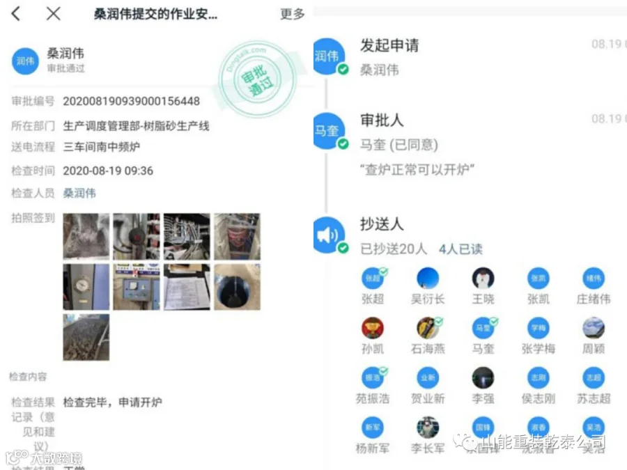 山能重装乾泰公司为全面做好能源集团重组期间的安全管理,对重点风险点细化管控措施。为保证电弧炉、中频炉开炉安全,乾泰公司开发利用钉钉软件进行开炉送电审批,首先由炉前工对照排查项目进行岗前排查,排查无隐患后由车间值班人员对重点检查部位拍照,将照片上传至钉钉作业安全检查进行审批,由公司安监处长或生产副总经理进行现场审批,审批通过后抄送公司相关领导、车间管理人员、综合部及值班人员,综合部在接到审批通过通知、送电申请单及车间值班人员电话后对中频炉高压送电,进一步加强开炉前隐患排查和高压送电管理。