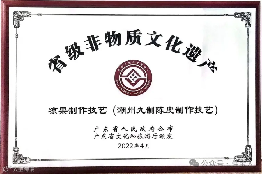 1995年企业被国务院发展研究中心授予“中华之最·全国最大的陈皮食品生产企业”荣誉。2022年公司所传承发展的潮州九制陈皮制作技艺被广东省文化和旅游厅认定为省级非物质文化遗产。