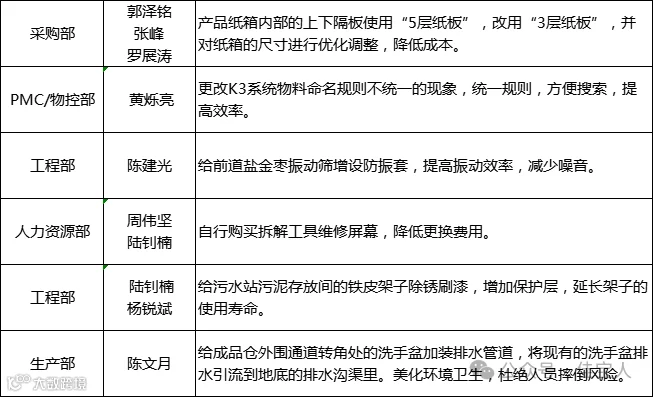 除了以上事例,这段时间以来被采纳的合理化建议提案者还有工程部的陈建光,给振动筛增加防振套减少噪音并提高效率;以及人资部的周伟坚、工程部的陆钊楠一起合作给LED屏幕进行维修更换等。