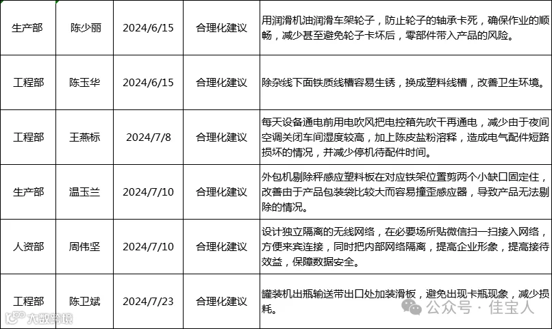 在这一个月的时间里,总共又有六位员工提出了新的合理化建议。分别是生产部的陈少丽、工程部的陈玉华、工程部的王燕标、生产部的温玉兰、人资部的周伟坚、工程部的陈卫斌。