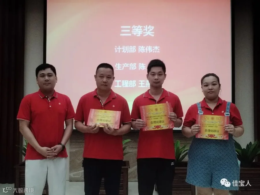 集团生产厂长郑炽盛为获奖者王燕标、陈伟杰、陈欢颁奖