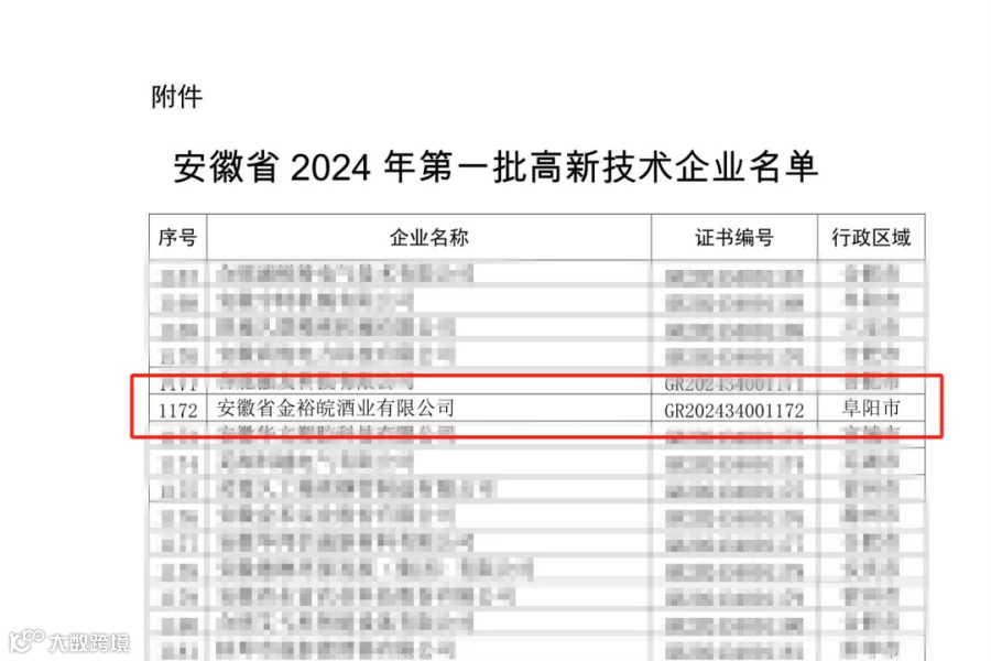 在国家级的资质认证中,高新技术企业是科技型企业最具含金量的荣誉之一,堪称中国科技型企业最高的荣誉之一。自创立伊始,金裕皖酒业便将科技创新奉为坚定不移的发展理念,积极投身产学研合作,全力推进技术创新与成果转化,高度重视知识产权保护,构建起严密的知识产权管理体系。至今,已先后获得国家级知识优势企业、省认定企业技术中心、阜阳市科技进步奖二等奖等荣誉称号,拥有国家专利81件,其中发明专利16件。这些荣誉与成果,源源不断地为公司的高质量发展注入强劲动力,助力其在激烈的市场竞争中稳健前行。