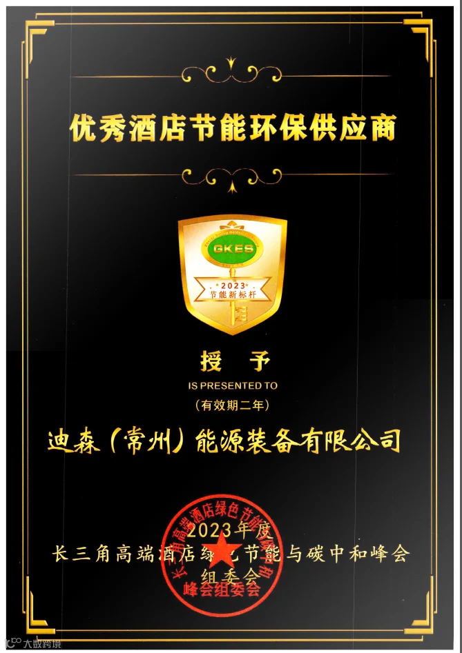 由会议组委会发起并主办的长三角酒店技能金钥匙奖评选活动也在现场揭晓,本次评选共选出“优秀能源管理酒店”“绿色节能达标示范酒店”“十佳酒店节能工匠”等5项奖项。迪森(常州)能源装备有限公司在本届“金钥匙”评选中荣获“优秀酒店绿色节能低碳供应商”。