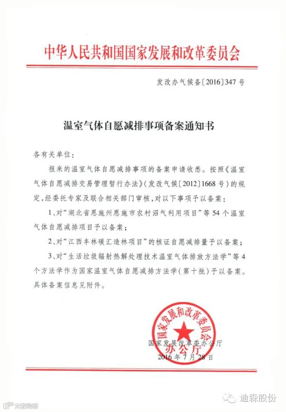 附:《温室气体自愿减排事项备案通知书》(发改办气候备〔2016〕347号)