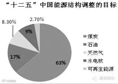 “十二五”中国能源结构调整的目标是:到2015年,煤炭在一次能源消费中的比重将从2009年的70%以上下降到63%左右,天然气、水电与核能以及其他非化石能源(主要是风能、太阳能和生物质能)的消费比重将从