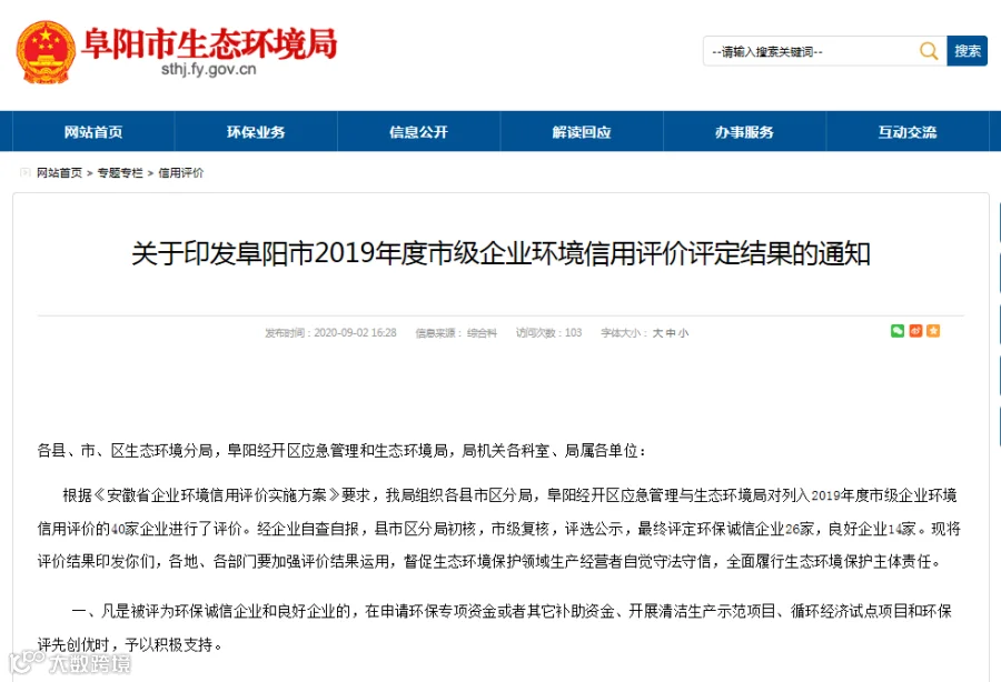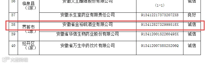 9月2日,阜阳市生态环境局发布的《阜阳市2019年度市级企业环境信用评价评定结果的通知》中获悉,金裕皖酒业被评为阜阳市2019年度“环保诚信企业”。其中,“环保诚信企业”是企业环境信用最高等级!金裕皖酒业是界首市白酒行业唯一获此殊荣的企业,标志着对公司环保工作的高度肯定。
