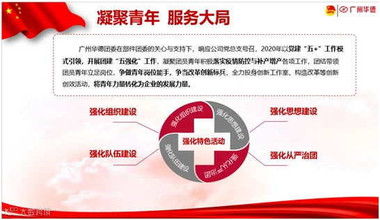 广州华德团委书记罗娟汇报了广州华德团建工作情况。2020年响应公司党总支号召,以党建“五+”工作模式引领,开展团建“五强化”工作,凝聚团员青年积极落实疫情防控与补产增产及降本增效各项工作,将青年力量转化为企业的发展力量。2021年将继续在公司党委和上级团委的领导下积极响应公司党总支“以高质量党建引领,推动华德事业体高质量发展”号召,凝聚华德事业体企业共识,团结广大青年推进华德事业体健全完善信息互通、资源共享、工作联动机制,助力打造上层统筹有力、中层运转高效、基层做实做强的运行体系,切实发挥好服务大局的生力军作用,为实现“十四五”良好开局而努力奋斗。