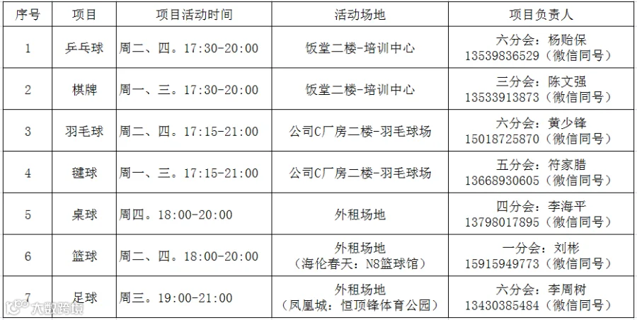 截止目前,公司一共成立7个兴趣小组,分别是足球、篮球、乒乓球、羽毛球、桌球、毽球、棋牌。具体信息如下: