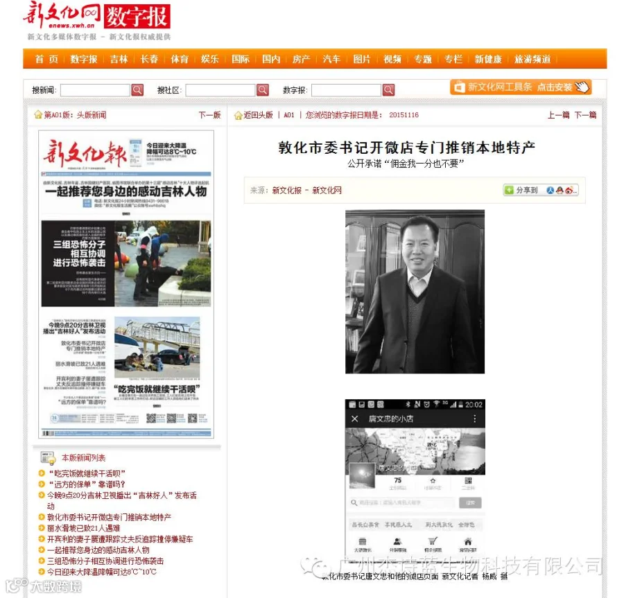 市委书记唐文忠受杭州市桐庐县电子商务电商销售一年卖出1.6个亿,村民都很富的启发当起微商微店的“店小二”,目的是推销敦化本地农副产品,支持敦化产业的发展,如今已经开了一万四千多个小店,分销商遍布全国24个省市,取得了非常好的效果。