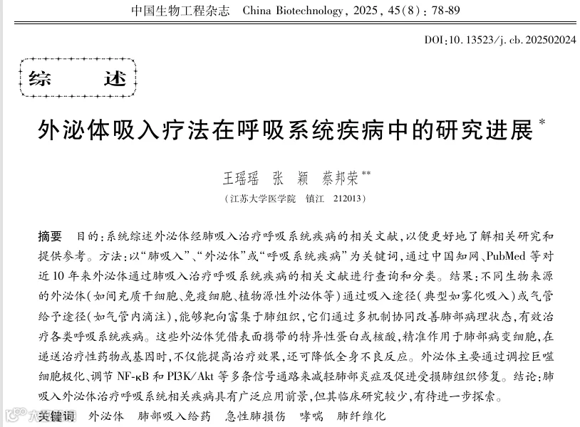 研究表明,间充质干细胞等不同来源的外泌体,可通过雾化吸入等途径靶向富集于肺组织,通过调控炎症通路、促进组织修复,有效治疗哮喘、肺纤维化等疾病;同时,外泌体在递送药物时能提升疗效并降低全身副作用,展现出广阔的临床应用前景。