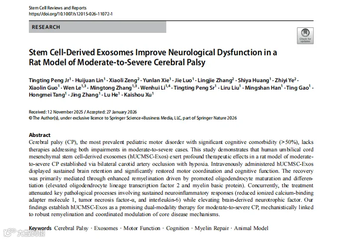2026 年 3 月,团队在《Stem Cell Reviews and Reports》发表重磅研究,首次证实静脉输注人脐带间充质干细胞外泌体,可同步修复中重度脑瘫大鼠的运动与认知功能,为脑瘫性脑瘫开辟了无细胞治疗的新路径。外泌体通过抗炎、抗氧化、促进神经突触再生,突破血脑屏障限制,疗效显著且安全性良好。