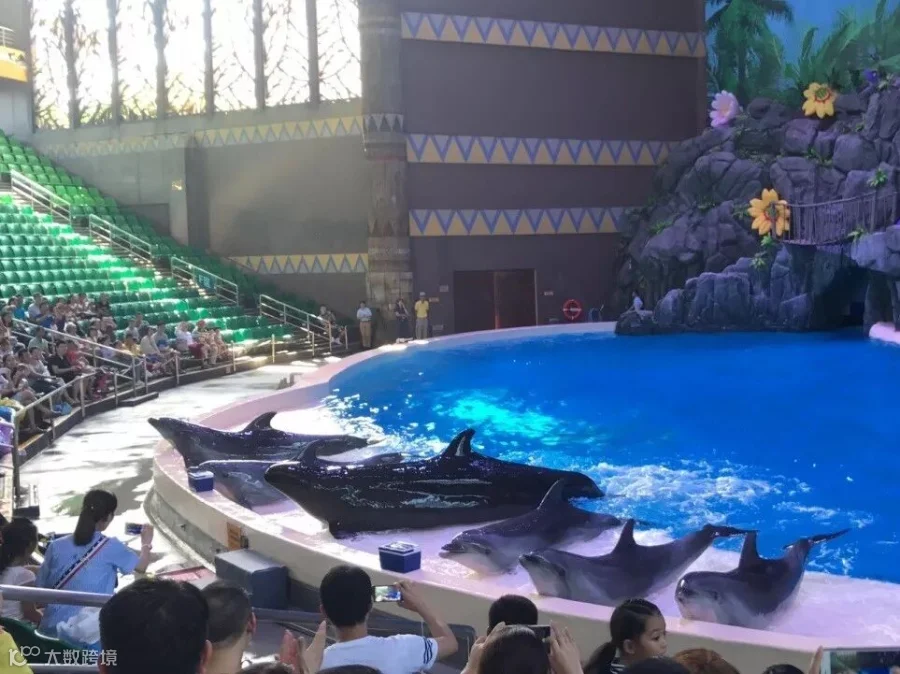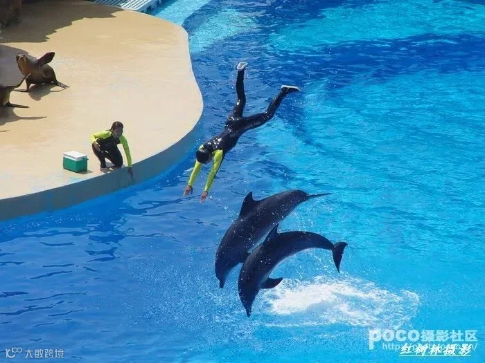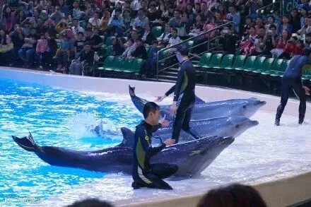为了观看海豚表演,我和大多数游客一样,在看台上等了约20分钟,但这等待显然是值得的。主持人每次会事先通报给观众即将要表演的项目,随后训练员便会以不同的手势来指挥海豚进行相应节目的表演。