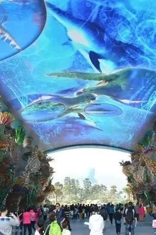 一一一进海洋王国的大门,便踏上了海洋大街。大街上方是一幅巨型天幕LED屏,反复播放着逼真的海洋生物影像。无数五彩斑斓的鱼儿在海里游来窜去的壮观景面吸引人们驻足观望,纷纷用相机留下这精彩的一幕,并不时发出赞叹声。大街两旁的柱子雕刻得十分精致,有鱼虾贝类、密密麻麻的海星,珊瑚等,惟妙惟肖,犹如真的置身于神奇的海底世界。