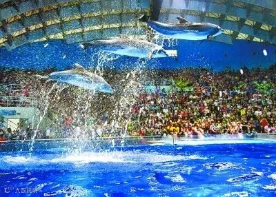 海豚剧场中的海豚表演也极其精彩,海豚是一种生性温顺又异常聪明的可爱生物。最早喜欢海豚,是缘于年少时看了洪金宝导演的电影《战神传说》,其中刘德华饰演的孤儿阿飞与名叫海威的海豚和谐共处的那段精彩嬉戏的场景和海威为了搭救阿飞突然窜出水面丈余高情景,都令我久经难忘。随后也经常在电视上看到被驯化的海豚按照训练师的指令在游泳池中做各种表演动作,或坐卧,或游泳,或跳跃,或与人共舞,动作干净利落,娴熟无比,犹如杂耍一般,甚是乖巧可爱。