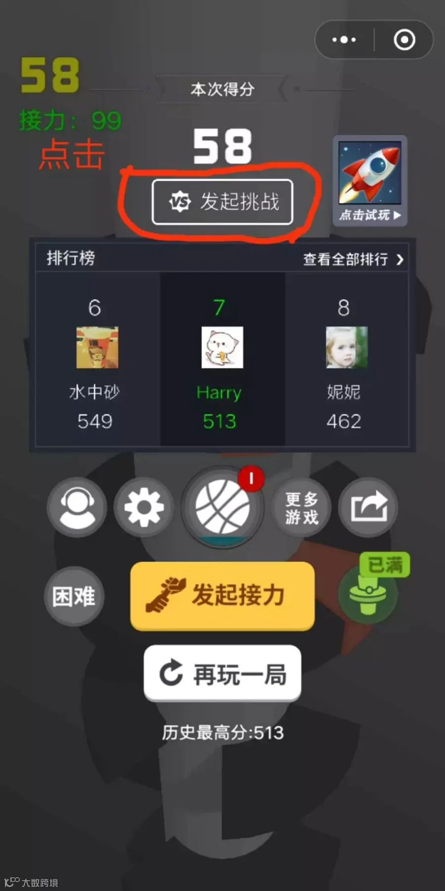 2.每局游戏结束后,如大家对自己当前的游戏得分满意。可直接点击“发起挑战”选项,然后点击“2018格来德旅游《远航》”在群内公布有效成绩。