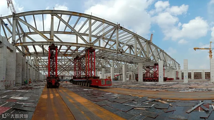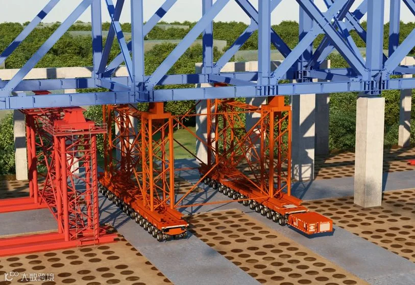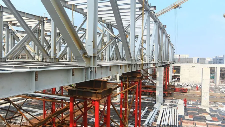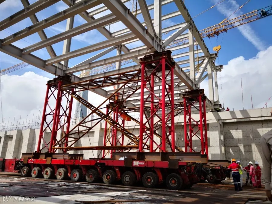 具体施工过程为先采用吊机对屋顶桁架进行拼装,在就位的 SPMT 上安装好运输工装,桁架拼装完成,SPMT 进入到相关的顶升位置,通过自顶升功能进行屋顶桁架的顶升作业,待钢桁架脱离胎架后,进行倒运平移工作,待 SPMT 走到指定位置后进行对位作业。对好位置后,SPMT 进行微调作业确保准确落位,然后焊接到钢板上面。