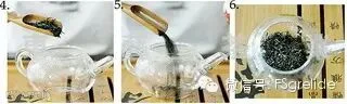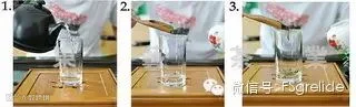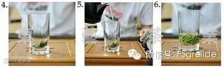 1-3.刚烧的开水温杯,用茶匙从茶叶罐里取适量茶叶(一般一次放5-7g,根据个人口味而定)放入玻璃杯中。