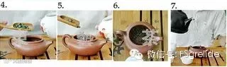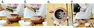 4-7.洗茶:取5g左右茶叶放入紫砂壶中,加入沸水,洗茶重在一个“快”字,不求将茶味泡出,只需让茶叶均匀受热,唤醒茶香即可。