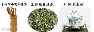 泡茶工具:陶瓷盖碗一个、碧螺春茶(这里以特级为例)、电水壶一个、基本功夫茶具一套(包括茶海一个、竹节茶道六件套一个、陶瓷储茶罐一个)如下图所示: