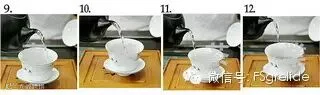 9--12.倒掉洗茶的水,沿着盖碗壁沿四周,将温水注入。