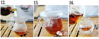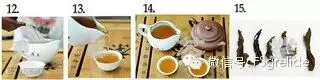 12-15.出汤:将泡好的茶汤倒入公道杯中,要低倒,快速。将公道杯中的茶汤分到小口杯里,浓郁的茶香即可即弥漫在空气中。