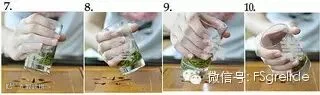 7-10.摇香30秒左右,手捧玻璃杯,朝一个方向轻轻摇动玻璃杯,让茶叶湿润均匀受热。