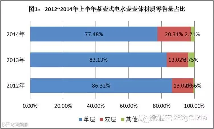 双层壶体的出现可谓是将电水壶的安全性提升到了另一个档次。传统的单层壶体在烧水的过程中不小心触碰可能引起烫伤,直接威胁到了使用者的安全;从能源角度来讲单层壶体热量流失快造成了能源浪费。而双层壶体的出现挽救了这个尴尬的局面,双层壶体中间的隔温层有效地将壶体外层温度控制在40度左右,即防止了烫伤的发生,同时隔温层也是一道物理保温层,将开水温度的流失速度减缓,节约了能源,双层壶体的出现大大的提升了茶壶式电水壶的安全性。具有安全节能特点的双层壶体产品宝剑一出锋芒毕露,如图1所示,双层电水壶从2012年零售量占比13.02%增长到了2014年上半年的20.31%。快速的抢占单层壶体的市场份额。相信在不久的将来,双层壶体将取代单层壶体成为市场的主流趋势。